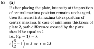 Q5.In YDSE, when a glass plate of refractive index 1.5 and thickness 𝑡 is placed in the path of one of the interfering beams (wavelength 𝜆), intensity at the position where central maximum occured previously remains unchanged. The minimum thickness of the glass plate is